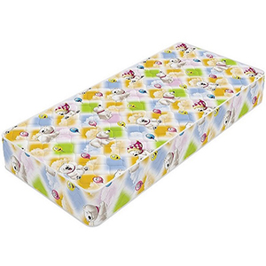 Верхнее покрытие матраса бязь с детским рисунком - хлопчатобумажная ткань полотняного переплетения. Особенность плетения заключается в том, что нити основы и утка имеют одинаковый размер и переплетаются равномерно. Ткань не имеет характерного блеска. Материал полностью натуральный. В целях достижения большей плотности, в волокна бязи добавляют синтетические нити. Однако доля синтетической примести не превышает 20%. Бязь широко используют при изготовлении верхнего покрытия детских матрасов.